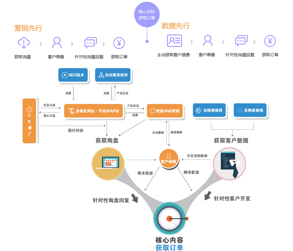 SEO技術(shù)通過(guò)搜索引擎為網(wǎng)站帶來(lái)流量,網(wǎng)站上展示VR全景看廠提升轉(zhuǎn)化率,產(chǎn)生更多詢(xún)盤(pán)。對(duì)詢(xún)盤(pán)進(jìn)行曾經(jīng)采購(gòu)行為分析,客戶畫(huà)像,進(jìn)行深度SNS挖掘獲得客戶詳細(xì)情況,并有目的地精準(zhǔn)聯(lián)系,獲得訂單。