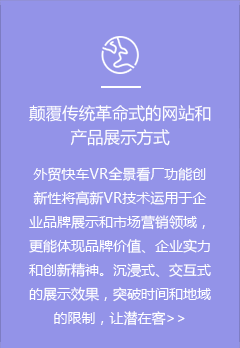 提升企業(yè)形象,VR看廠結(jié)合外貿(mào)快車(chē)網(wǎng)站產(chǎn)品展示,并可以在VR看廠點(diǎn)擊WEBSITE回到外貿(mào)快車(chē)網(wǎng)站里,提升轉(zhuǎn)換,獲取詢(xún)盤(pán)。